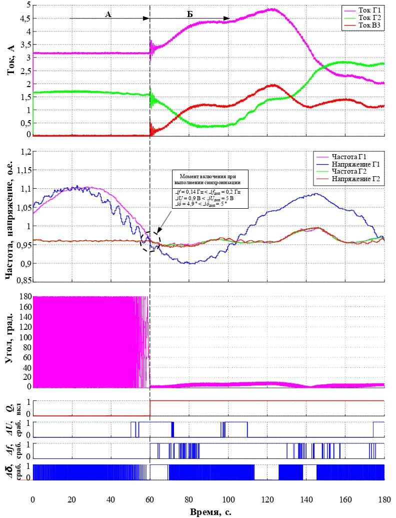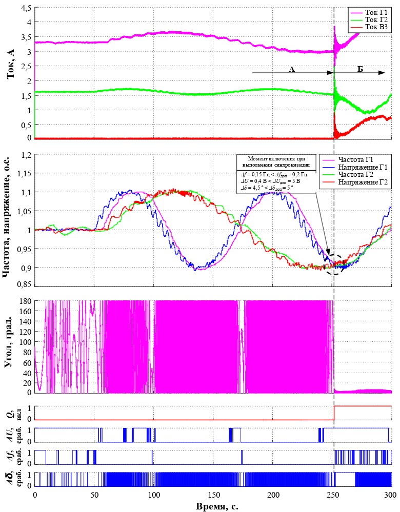 В эксперименте выключатели В1, В2 выполняли функцию генераторных выключателей, а выключатель В3 – синхронизирующего удаленного коммутационного аппарата.