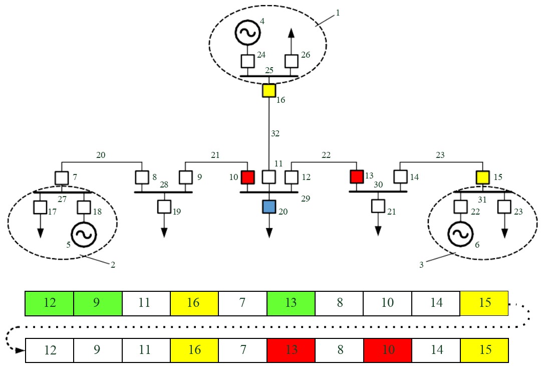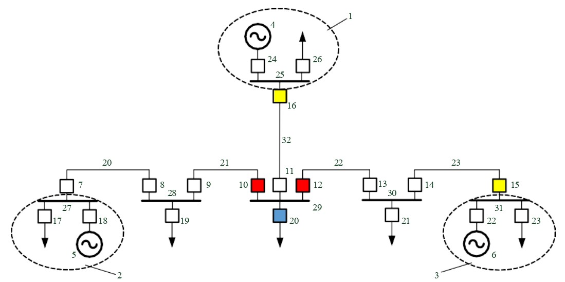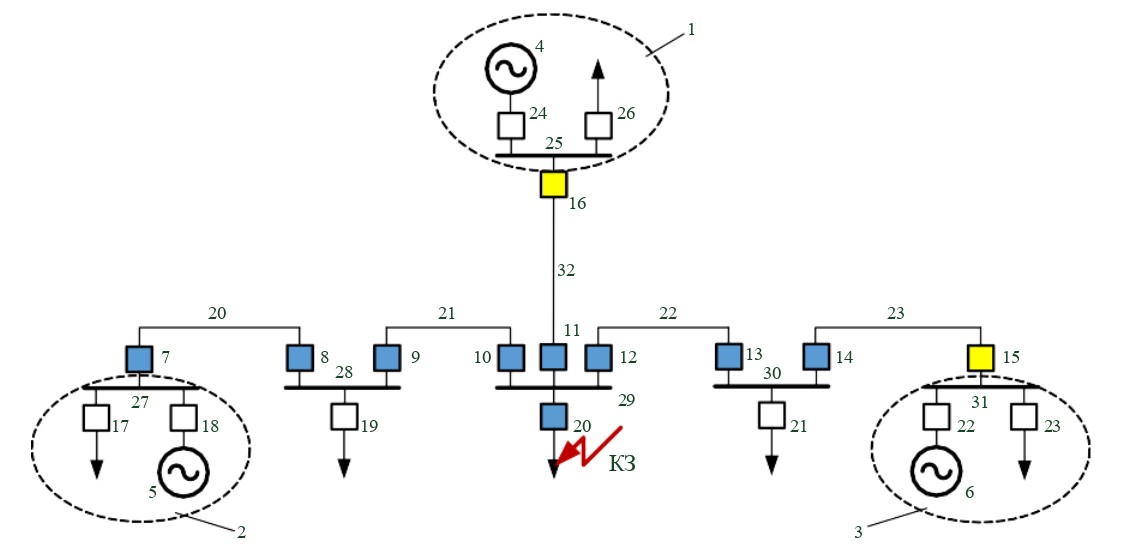 Схема электрической сети (рис. 12) содержит: 1,2,3 - районы электрической сети с генерацией, 4,5,6 - управляемые контроллерами генераторы, с выключателями 18,22,24, подключенными к шинам 26,27,31, 17,19,20,21,23,25 - выключатели фидеров нагрузки, подключенные к шинам 26,27,28,29,30,31, 7,8,9,10,11,12,13,14,15,16 - сетевые выключатели с улавливателями синхронизма, подключенные к шинам 26,27,28,29,30,31, 20,21,22,23,32 - линии электропередачи, связывающие через выключатели шины объектов электрической сети 26,27,28,29,30,31. Коммутационное состояние выключателей соответствует послеаварийному режиму с резделением сети на три активных части (1,2,3) и двумя пассивными (шины 28, 29) после отключения КЗ на фидере нагрузки за выключателем (20). Желтым цветом выделены сохранившее включенное состояние выключатели, синим – отключенные по факту снижения напряжения в результате возникновения КЗ.