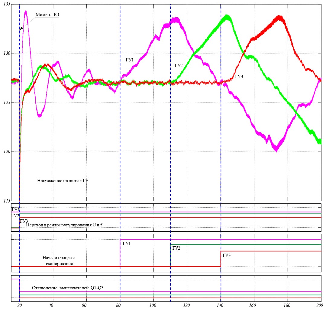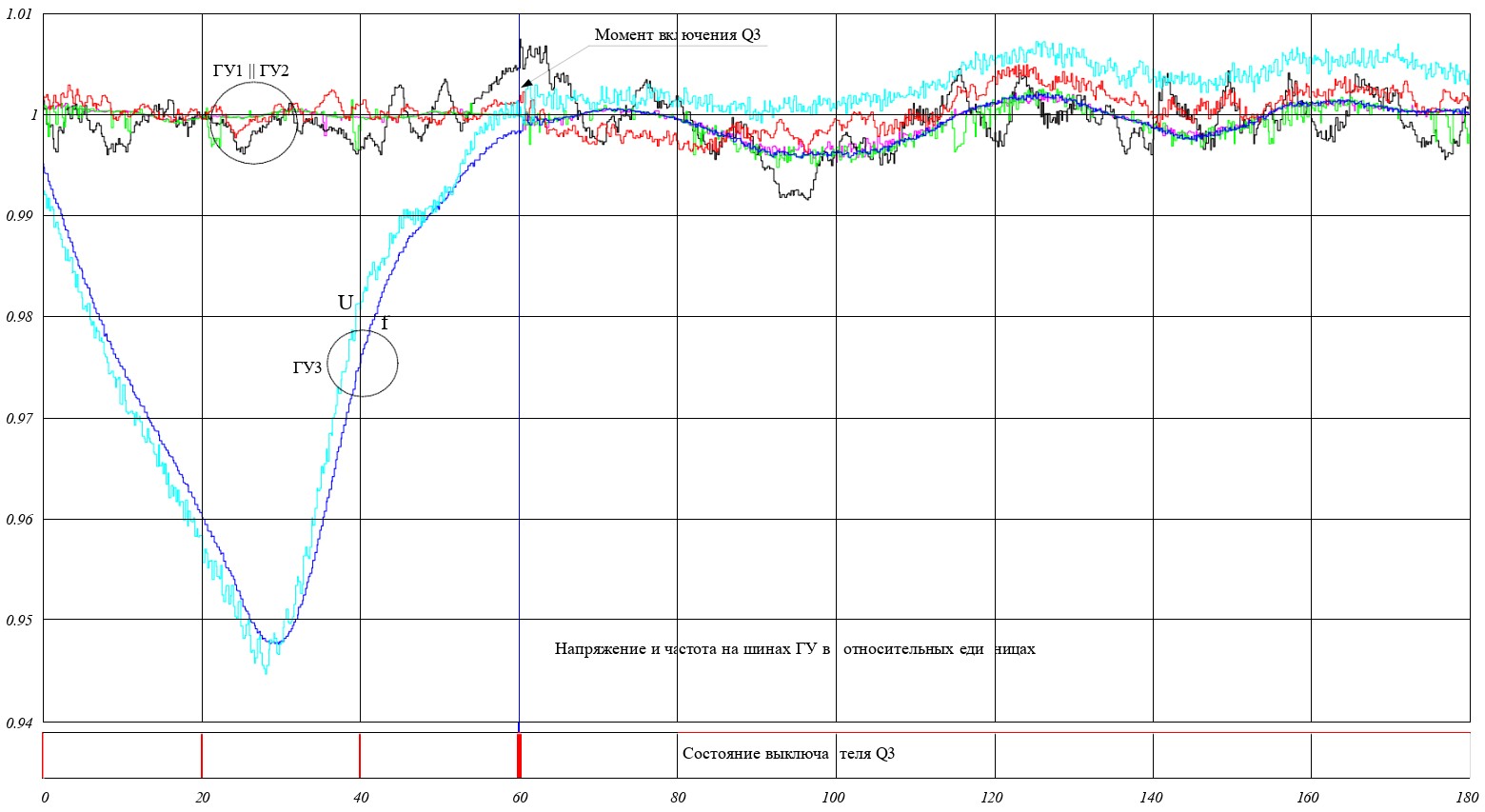 - Имитируется режим трехфазного КЗ путем ручного включения выключателя Q4 на закоротку. В результате такого возмущения встроенные защитные функции в устройствах АПВ должны отключить выключатели Q1 - Q3, генераторы ГУ2 и ГУ3 должны перейти в режим регулирования частоты и напряжения, и, через заданные выдержки времени (60, 90 и 120 с соответственно), начать процесс «сканирования» (выполнено успешно, рис. 22).