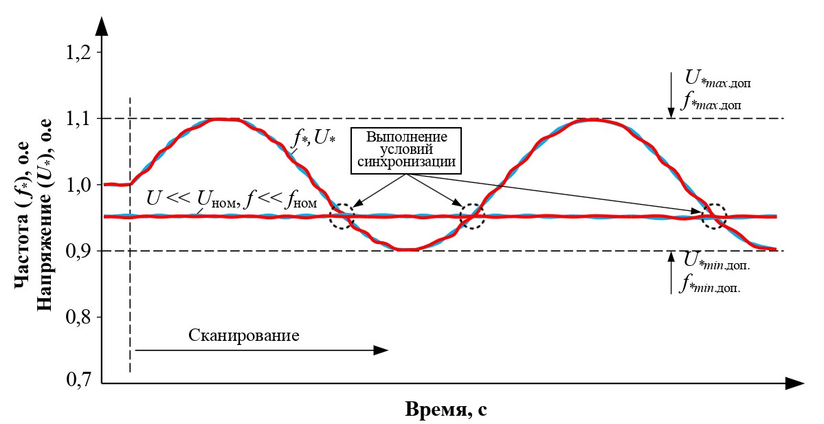 - регуляторы возбуждения и мощности генератора более низкого приоритета в группе генераторов, сканирующих условия синхронизации, переводятся в режим поддержания постоянной активной и реактивной мощности до истечения заданного времени восстановления целостности электрической сети;
