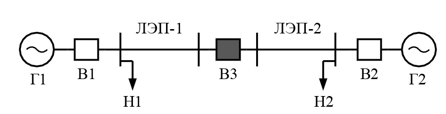 Также, в эксперименте использованы модели линии электропередач ЛЭП-1 и ЛЭП- 2; выключатели В1-В3; активные нагрузки Н1 мощностью 900 Вт, и Н2 мощностью 450 Вт.