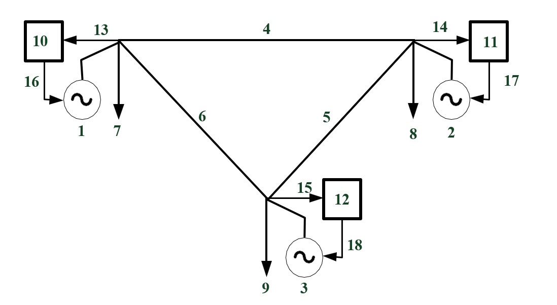 1,2,3 – генераторы энергоблоков электростанций, 4,5,6 – линии электропередачи, образующие электрическую сеть, 7,8,9 – нагрузки в узлах электрической сети, 10,11,12 – интеллектуальные контроллеры управления мощностью энергоблоков электростанций, 13,14,15 – каналы измерения частоты и выдаваемой генераторами энергоблоков мощности,16,17,18 – каналы воздействия контроллеров на выдаваемую генераторами энергоблоков мощность