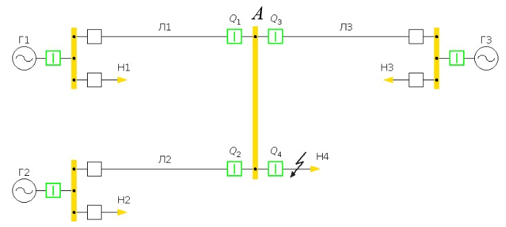 На (рис. 12) представлен пример схемы электрической сети (с выделением синим цветом отключенных выключателей после возникновения короткого замыкания (КЗ) на фидере нагрузки за выключателем) в которой после ее аварийного разделения осуществляется удаленная синхронизация аварийно разделившихся частей сети и восстановление нормального режима их параллельной работы.