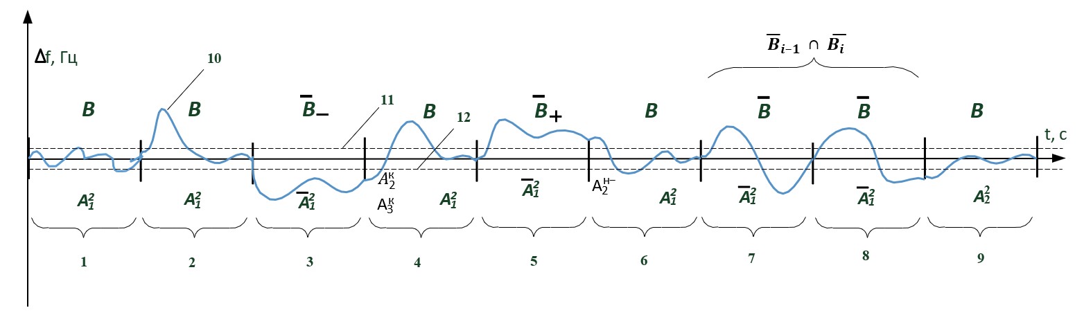 1-9 - номера синхронизированных для всех контроллеров (рис. 1) тактовых интервалов времени, 10 - график изменения частоты в энергосистеме, 11, 12 – верхняя и нижняя границы эффективного удержания частоты в ЭЭС вторичным регулированием, В с модификациями – классы состояния системы регулирования частоты и мощности в энергосистеме, А с модификациями – указатель участника регулирования частоты на такте времени и характера его участия