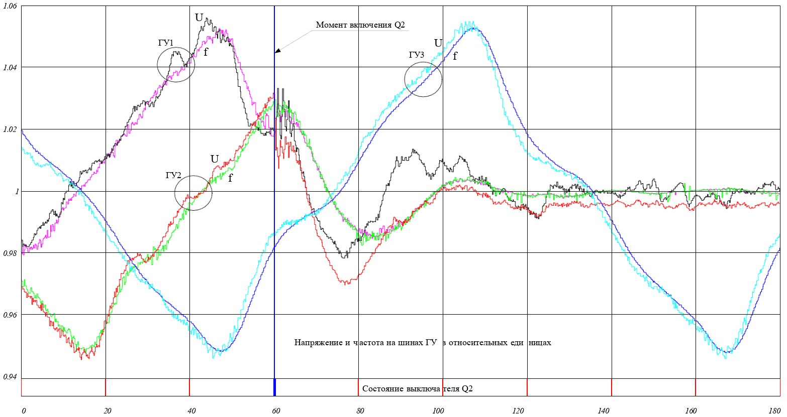 - После отключения КЗ должен включиться выключатель Q1, что приведет к появлению напряжения на шинах А (рис. 21). В процессе сканирования на выключателе (например) Q2 создаются условия для синхронизации, и он включается. Фиксируя электромеханический процесс ГУ1 и ГУ2 должны прекратить процесс сканирования и перейти в исходный режим регулирования: ГУ1 - режим вторичного регулирования частоты и напряжения, ГУ2 - в режим выдачи заданной мощности или поддержания заданного перетока по сечению. В таком режиме частота в объединенной сети поддерживается на уровне 50 Гц. ГУ3 продолжает процесс сканирования (выполнено успешно, рис. 23).