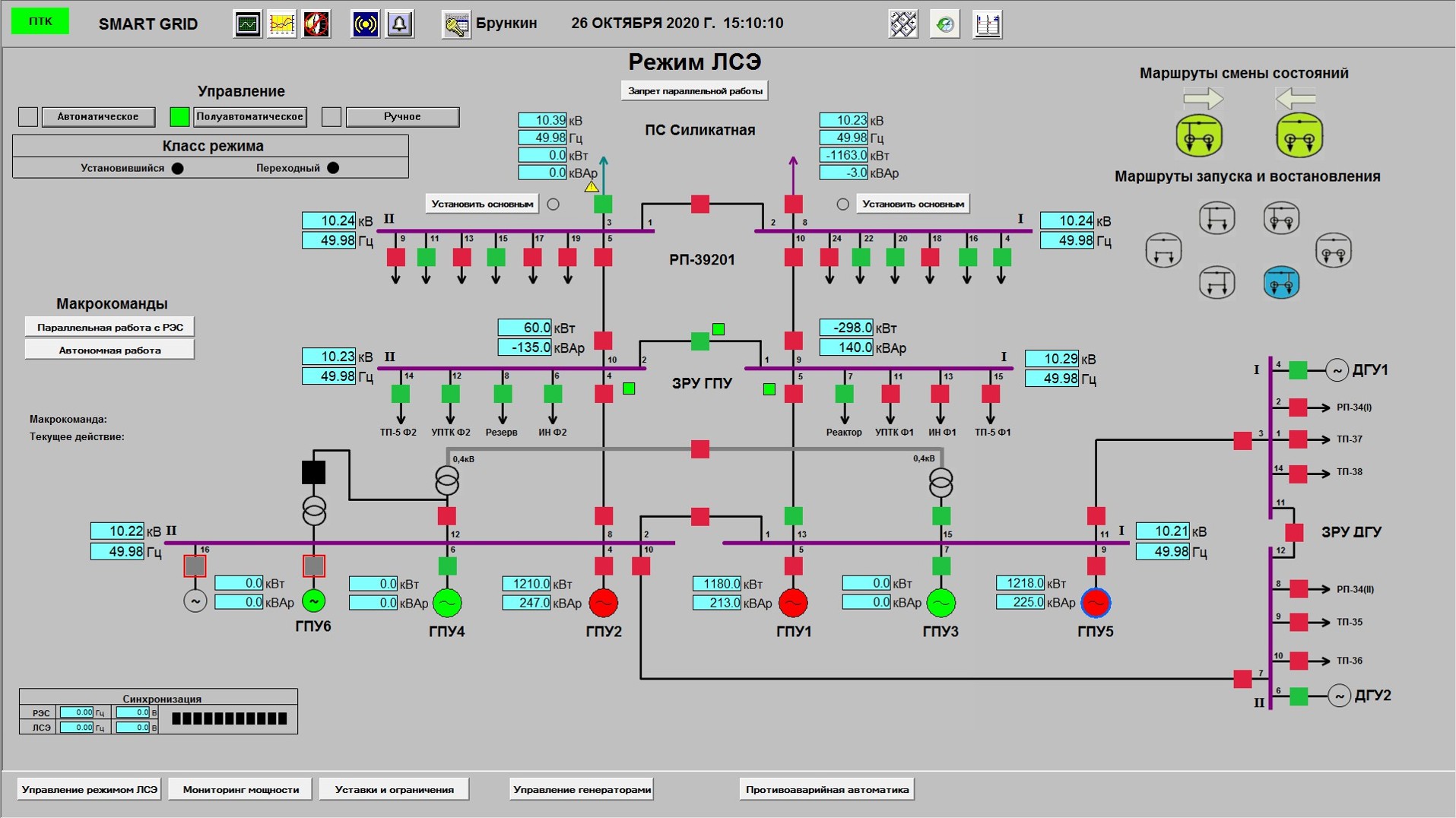 В режиме автономной работы Минигрид мощность регулируется пропорционально – интегральными (ПИ) регуляторами скорости энергоблоков с выравниванием загрузки работающих энергоблоков.
