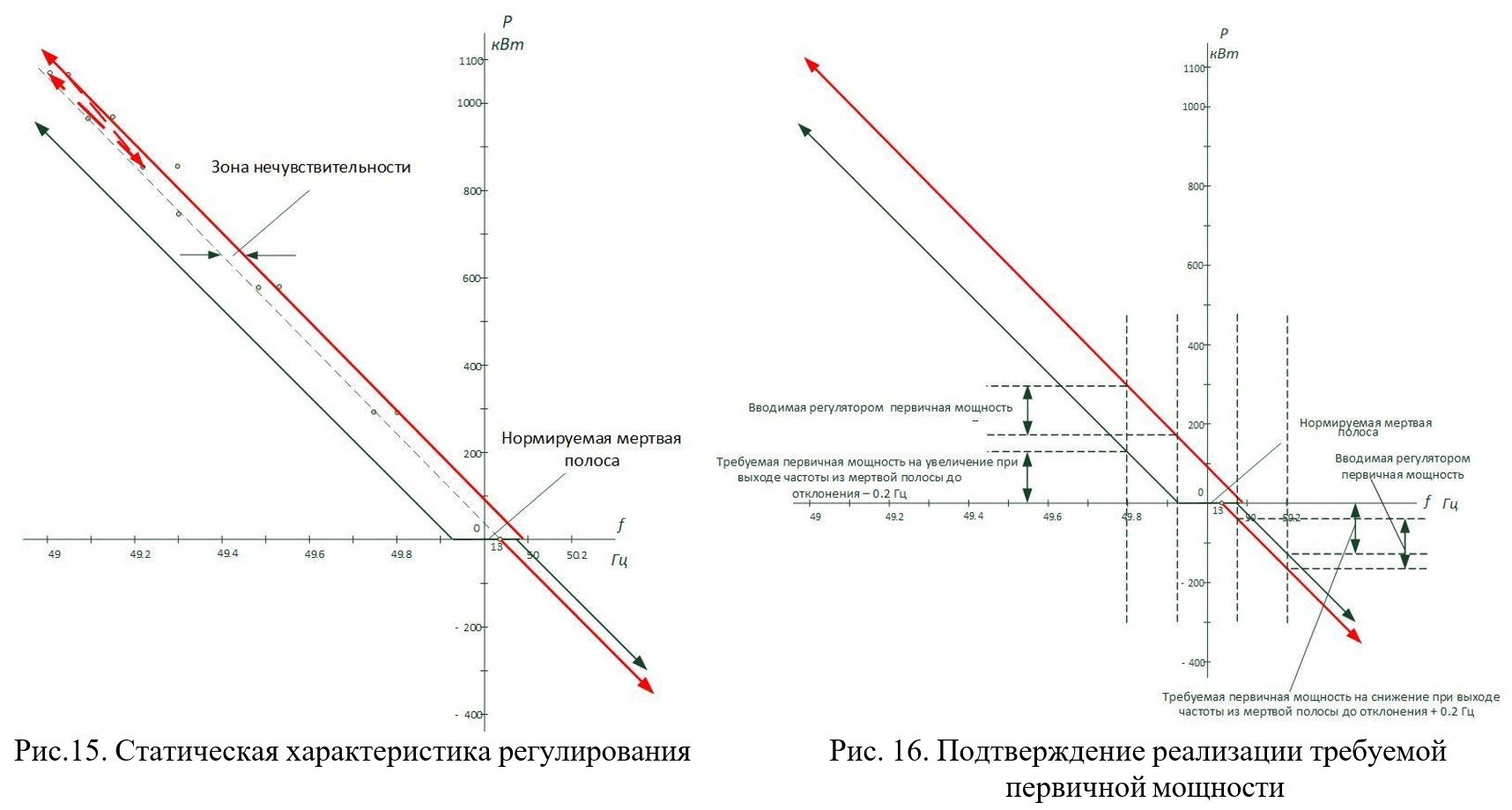 11 | Маневренные характеристики ГО при скачкообразном отклонении частоты при величине требуемой первичной мощности должны обеспечивать: ввод не менее половины требуемой первичной мощности за время не более 15 секунд; в случае скачкообразного отклонения частоты должна обеспечиваться реализация всей требуемой первичной мощности за время не более 1 минуты; | Подтверждается осциллограммами процесса при сбросах набросах нагрузки в автономном режиме |