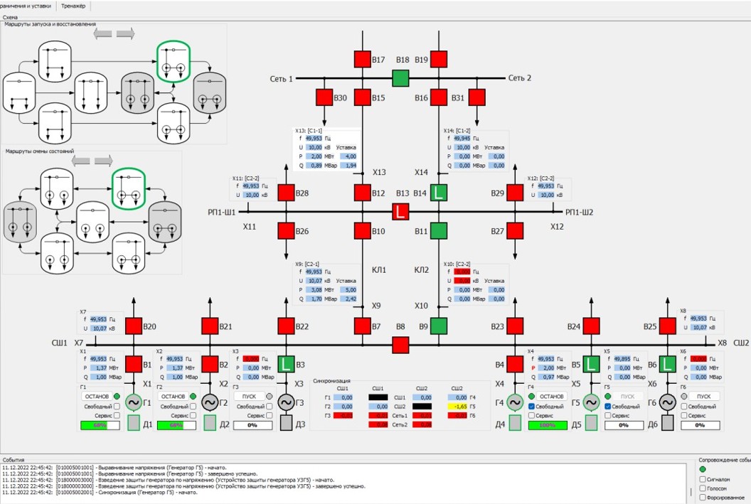 Аннотация: Представлены результаты разработки цифрового двойника (симулятора) самобалансирующихся локальных интеллектуальных энергосистем (Минигридов) на основе синхронной малой генерации. Цифровой двойник адекватен реальному объекту с управлением на основе специализированной системной автоматики, использующей инновационные способы противоаварийного и режимного управления Минигридами, интегрированных в существующие электрические сети централизованного энергоснабжения. Симулятор позволяет оператору осуществлять запуск электростанции с нуля при автономной работе или при поданном питании на шины станции со стороны внешней энергосистемы, выбор состава работающего генерирующего оборудования с учетом нескольких сечений в схеме выдачи мощности и условий сбалансированности при противоаварийном отделении, разные заданные режимы обмена мощностью с внешней сетью, создавать и ликвидировать аварийные ситуации. Интерфейс оператора, средства манипулирования и наблюдения максимально приближены к реальным, реализованным в пилотном проекте создания Минигрид жилмассива на базе когенерационной газовой электростанции. Симулятор предназначен для обучения студентов электроэнергетиков со специализацией по управлению режимами энергосистем и активных электрических сетей, содержащих распределенную малую генерацию, а также для подготовки дежурного персонала реальных Минигрид, интегрированных в существующие электрические сети. В симуляторе реализованы возможности ручного и полуавтоматического управления режимами Минигрида при островной и параллельной работах с сетью, а также переходами между ними.