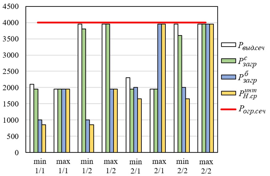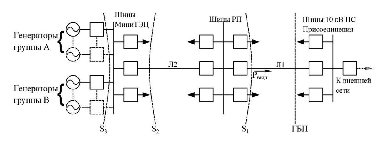 В дефицитном режиме деление происходит по сечению S2 с устранением дефицита мощности Минигрид путем отнесения части нагрузки (нагрузки РП) к внешней сети.