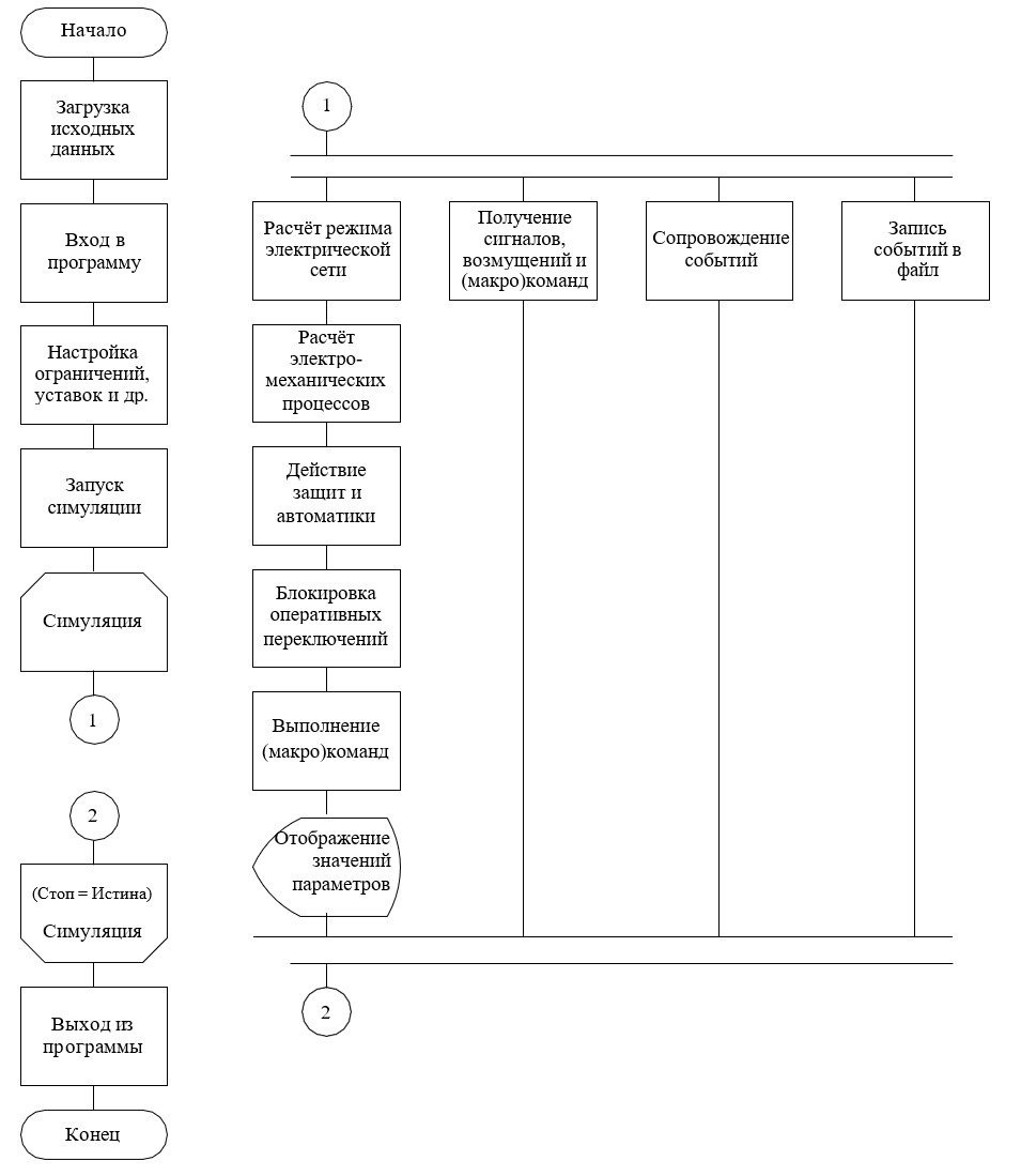 Алгоритм Симулятора представлен на рис. 10. После запуска программы и загрузки исходных данных пользователю предлагается пройти аутентификацию, настроить доступные параметры симуляции, выбрать действующие ограничения и уставки, запустить симуляцию. Симуляция выполняется в цикле последовательной обработки имеющихся данных и параллельно поступающих от пользователя команд, моделируемых сигналов и возмущений. На каждом шаге симуляции осуществляется звуковое и визуальное сопровождение событий (если они произошли) и их запись в файл.
