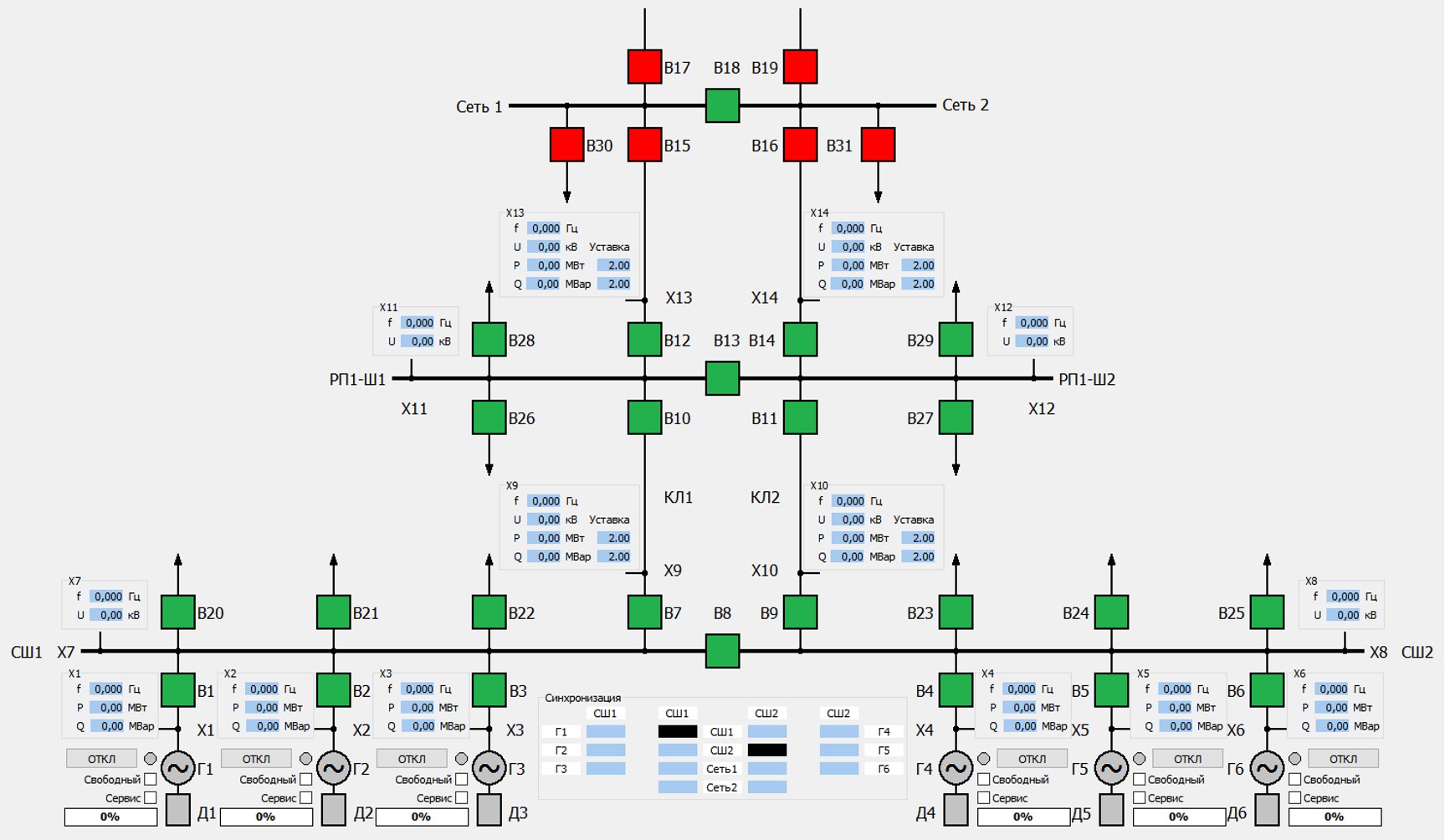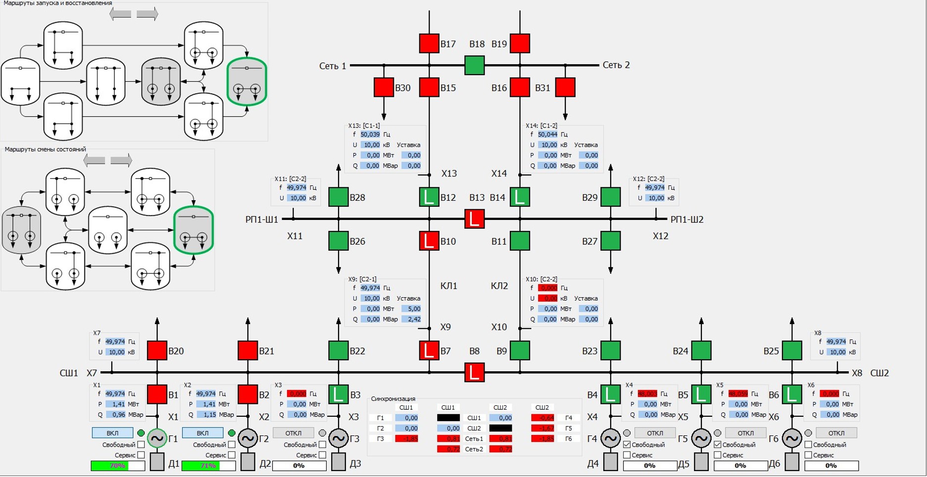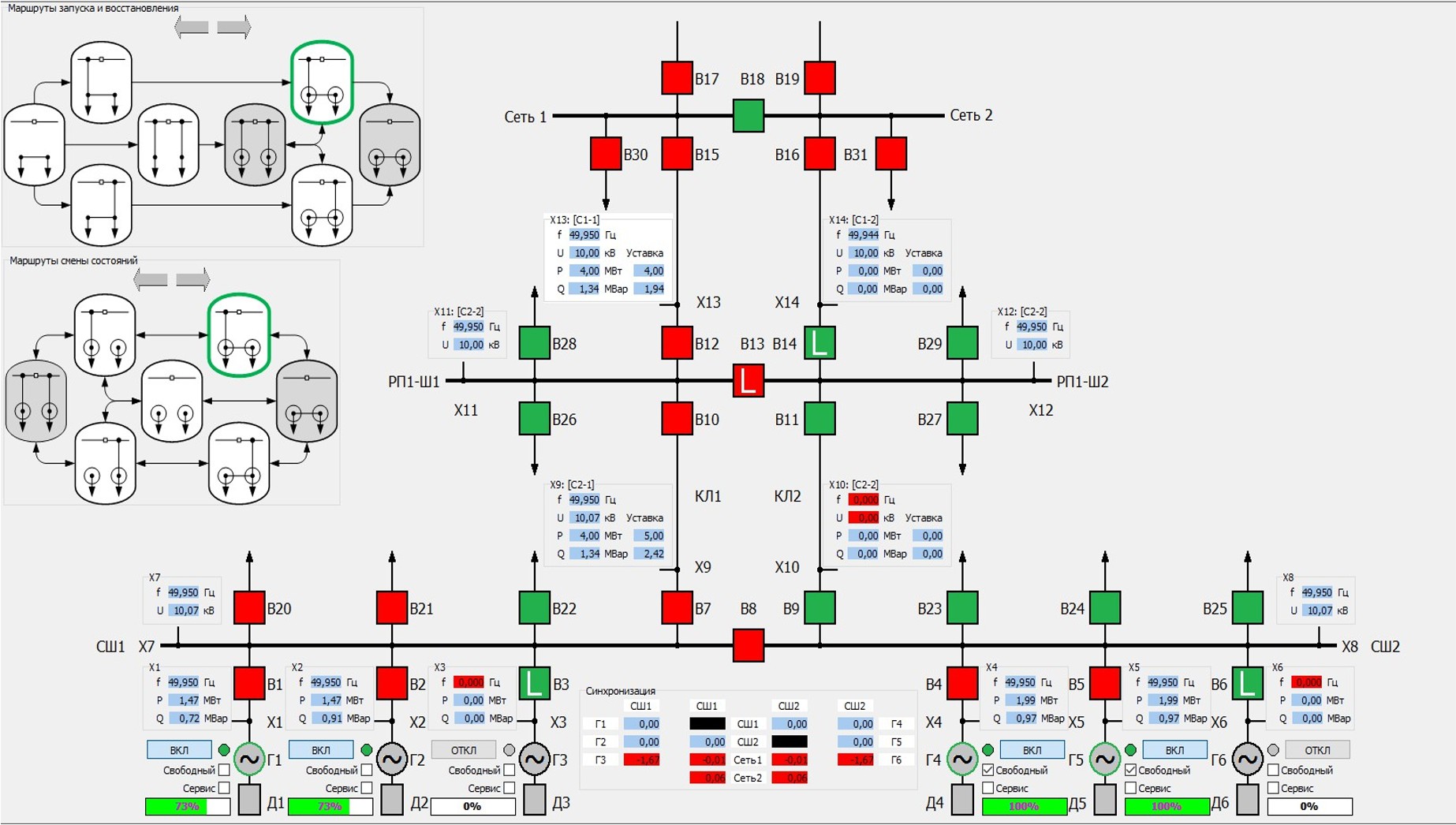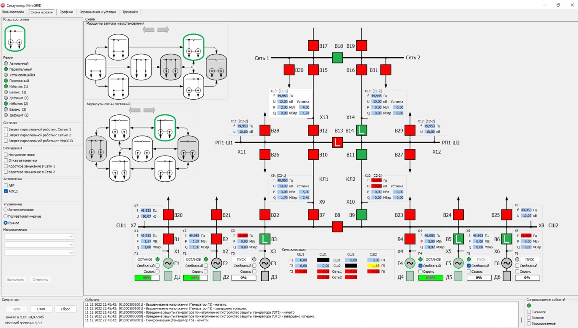 С | При снятии запрета на параллельную работу и восстановлении условий для осуществления нормального режима Минигрид синхронизируется с приемной энергосистемой, восстанавливается требуемый состав, загрузка и режимы регулирования мощности генераторов обеих групп генераторов. | C1 – Снятие запрета на параллельную работу C2 – Минигрид синхронизируется с приемной энергосистемой C3 – Восстанавливается режим параллельной работы: C4 – Генераторы Г1 и Г2 переводятся в режим регулирования перетока с долевым участием в мощности ведущего генератора Г1 C5 – Восстанавливается состав и загрузка генераторов для выдачи мощности в приемную ЭС: Г4 и Г5 |