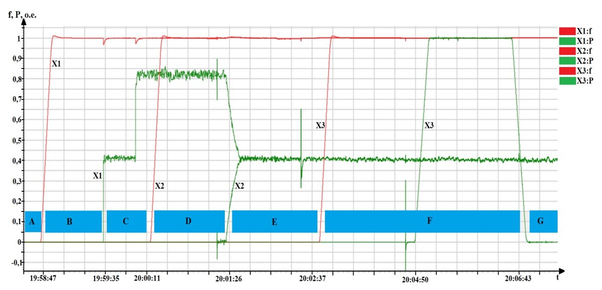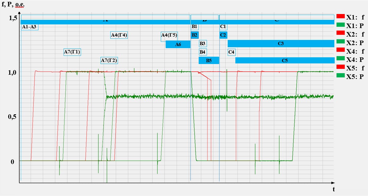 На рисунке 14 приведены графики изменения режимных параметров в процессе управления Минигридом системной автоматикой, в т.ч. ее автооператором, зарегистрированные на физической электродинамической модели Минигрид в НГТУ.