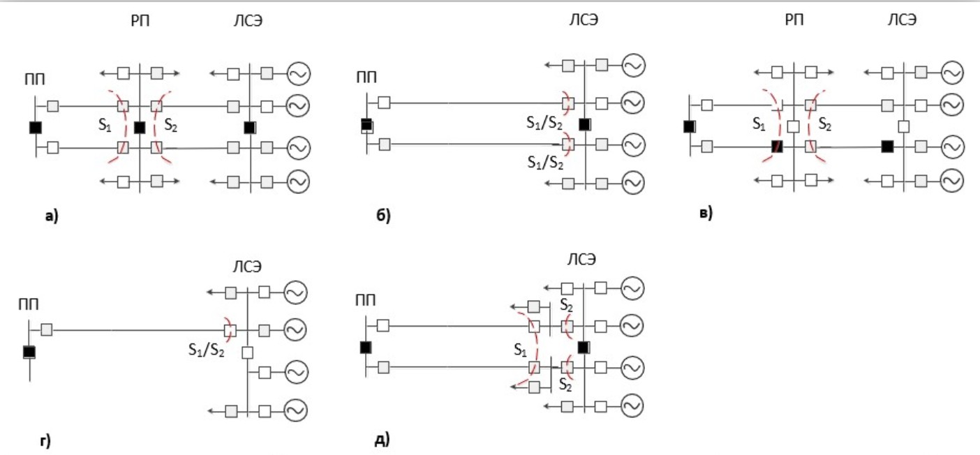 а) Базовая схема с разделяющейся на две симметричные части Минигрид с РП; б) Схема с разделяющейся на две симметричные части Минигрид без РП; в) Схема с неразделяющейся на части Минигрид с РП с основной и резервной связью с внешней сетью; г) Схема с неразделяющейся на части Минигрид без РП с одной связью с внешней сетью; д) Схема с разделяющейся на части Минигрид без РП с повышенной вариативностью отделения от внешней сети