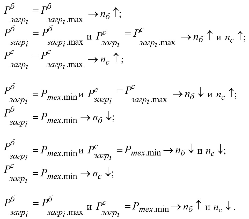 В этом режиме энергоблоки группы А загружены на величину собственной нагрузки Минигрид с допустимым при противоаварийном экспресс-отделении от внешней сети небалансом, позволяющим сохранить их в работе без отключения. Энергоблоки группы В загружены на величину заданной оперативной уставки (Рг(В) = Рвыд = Рзад). Эти условия поддерживаются режимной автоматикой в нормальных режимах. Режимная автоматика поддерживает эти параметры при отсутствии возмущений (стационарный нормальный режим).